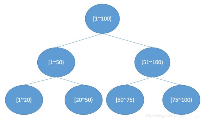 我们首先可以用shift==0找到范围的起点后终点(有可能没有相等的,比如搜索422,也会找到423)。然后一直往上找,直到找到一个共同的祖先(肯定能找到,因为树根是所有叶子节点的祖先),对应起点,每次往上走的时候, 左边范围节点都要把它右边的兄弟节点都加进去, 右边范围节点都要把它左边的兄弟节点加进去, 若已经到达顶点, 则是将左边范围节点和右边范围节点之间的节点加进行去