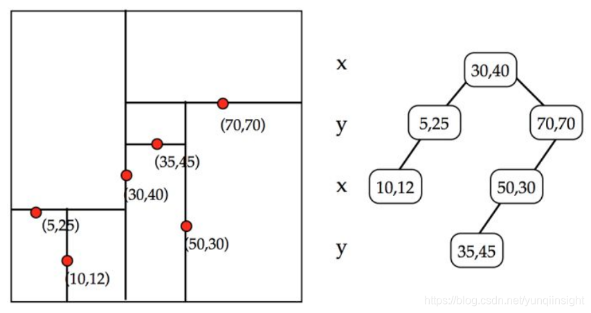 - 递归进行步骤1,2,我们可以设置一个阈值,点的数目少于多少后就不再切分,直到所有的点都切分好停止。