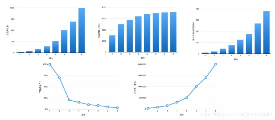 当我们只关注行为价值,不关注架构价值时,会发生什么事情?这是书中记录的一个真实案例,随着版本迭代,工程师团队的规模持续增长,但总代码行数却趋于稳定,相对应的,每行代码的变更成本升高、工程师的生产效率降低。从老板的视角,就是公司的成本增长迅猛,如果营收跟不上就要开始赔钱啦。