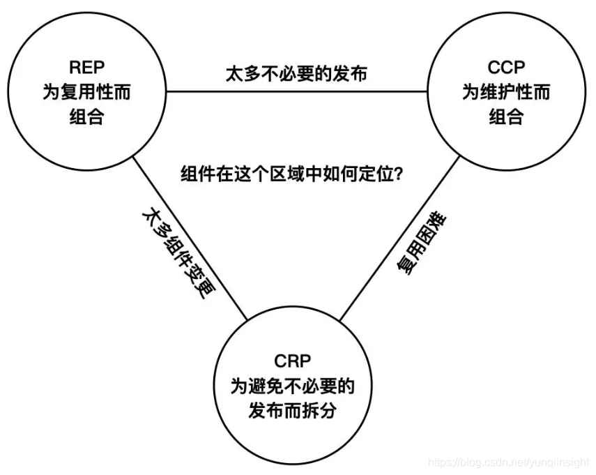 REP、CCP、CRP 三个原则之间存在彼此竞争的关系,REP 和 CCP 是黏合性原则,它们会让组件变得更大,而 CRP 原则是排除性原则,它会让组件变小。遵守REP、CCP 而忽略 CRP ,就会依赖了太多没有用到的组件和类,而这些组件或类的变动会导致你自己的组件进行太多不必要的发布;遵守 REP 、CRP 而忽略 CCP,因为组件拆分的太细了,一个需求变更可能要改n个组件,带来的成本也是巨大的。