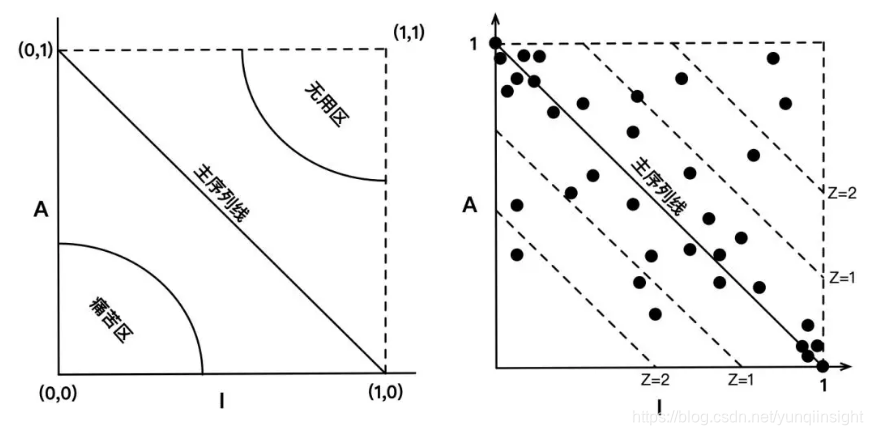 将不稳定性(I)作为横轴,抽象程度(A)作为纵轴,那么最稳定、只包含抽象类和接口的组件应该位于左上角(0,1),最不稳定、只包含具体实现类,没有任何接口的组件应该位于右下角(1,0),他们连线就是主序列线,位于线上的组件,他们的稳定性和抽象程度相匹配,是设计良好的组件。位于(0,0)周围区域的组件,它们是非常稳定(注意这里的稳定指的是变更成本)并且非常具体的组件,因为他们的抽象程度低,决定了他们经常改动的命运,但是又有许多其他组件依赖他们,改起来非常痛苦,所以这个区域叫做痛苦区。右上角区域的组件,没有其他组件依赖他们,他们自身的抽象程度又很高,很有可能是陈年的老代码,所以这个区域叫做无用区。