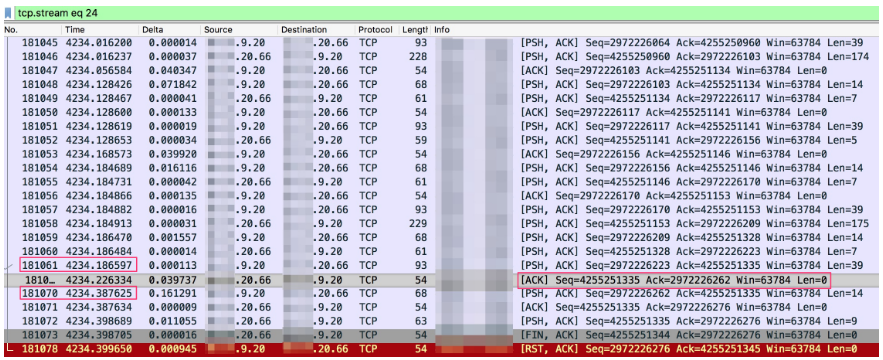 - 181073 号包是服务器端FIN掉了连接,181078号包客户端接着发了TCP Reset。