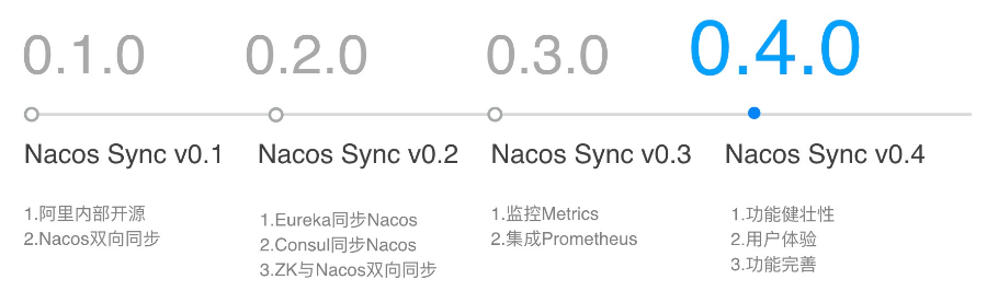 Nacos Sync 目前已经发布3个小版本,通过下图,我们可以看到每个版本已经做了的一些工作,以及下个版本即将做的一些事情。