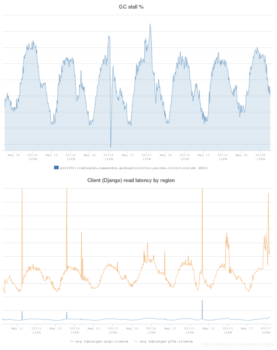 下面的图显示了一个生产 Cassandra 集群的客户端延迟。蓝线是平均读取延迟(5ms),橙色线是 P99 读取延迟(在25ms到60ms的范围内)。