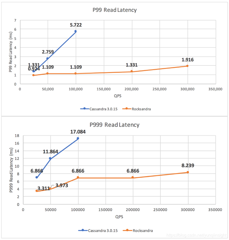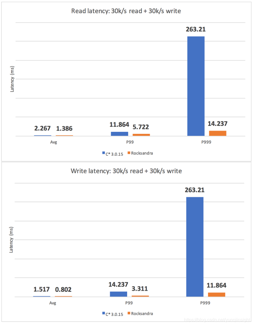 我们测试了不同的工作负载并测量了 avg/P99/P999 读/写延迟。如我们所见,Rocksandra 提供了更低且一致的读/写延迟。