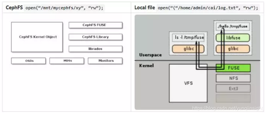 上图中,cephfs 和本地文件系统,底层对应完全不同的实现,但是上层 client 可以不用区分对待,采用同样的接口来操作,只通过路径不同来区分。