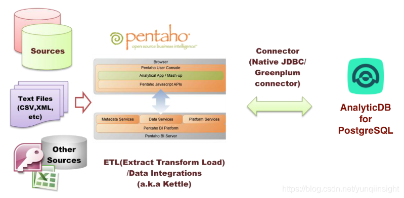 下图显示了Kettle和ADB for PostgreSQL之间的关系,数据源通过Kettle进行ETL或数据集成操作以后可以和ADB for PostgreSQL进行交互: