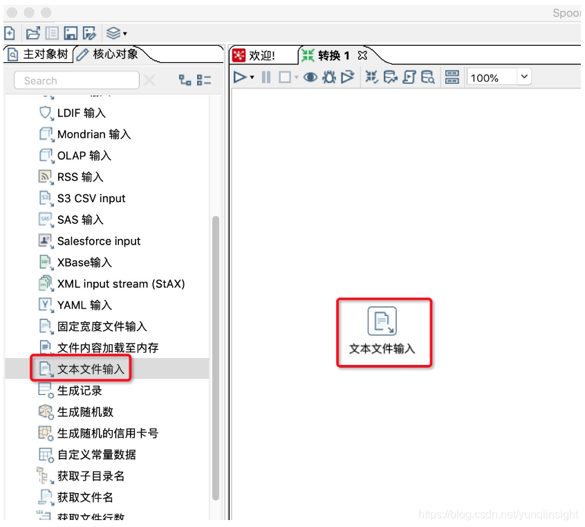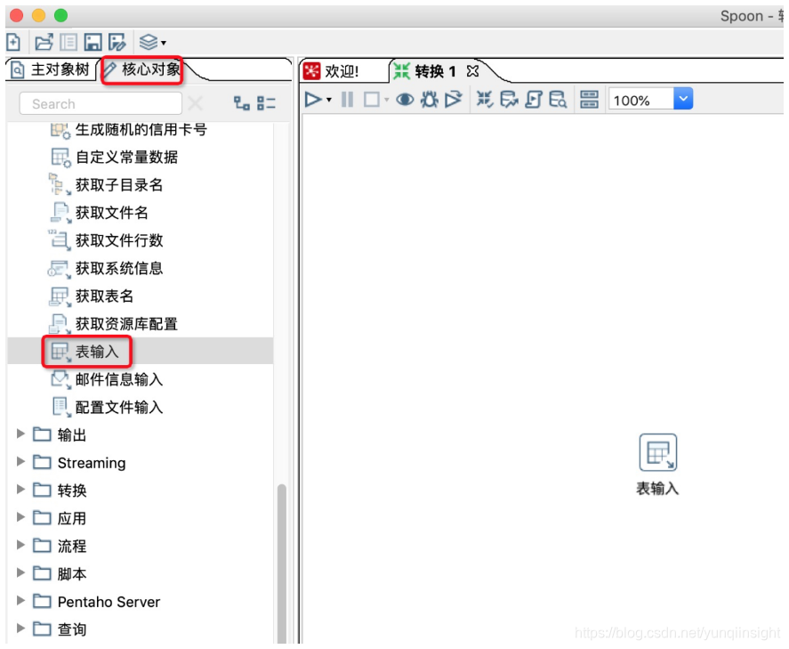 6.在kettle左侧核心对象的输入中,找到表输入,并将其拖动入到工作区。