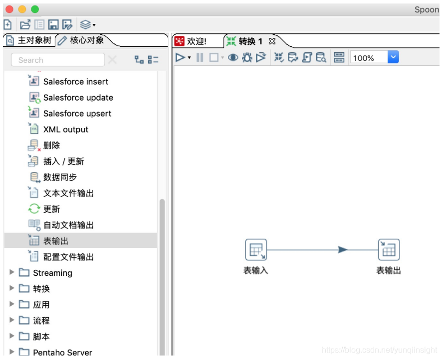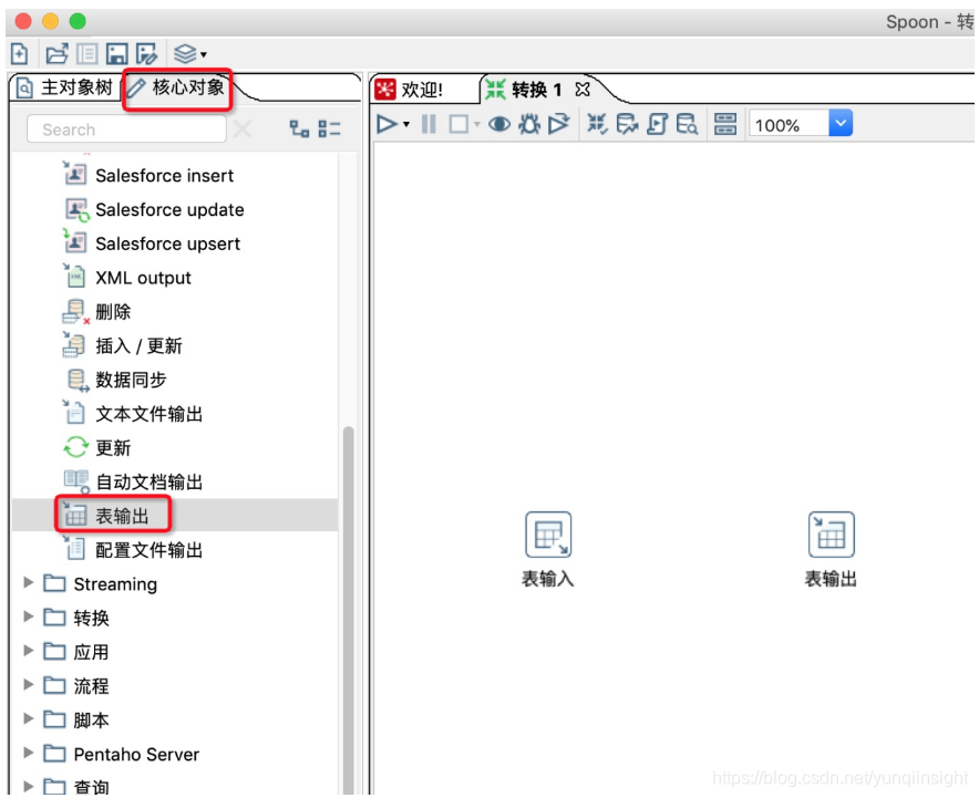 8.在Kettle左侧核心对象的输出中,找到表输出,并将其拖动入到工作区。
