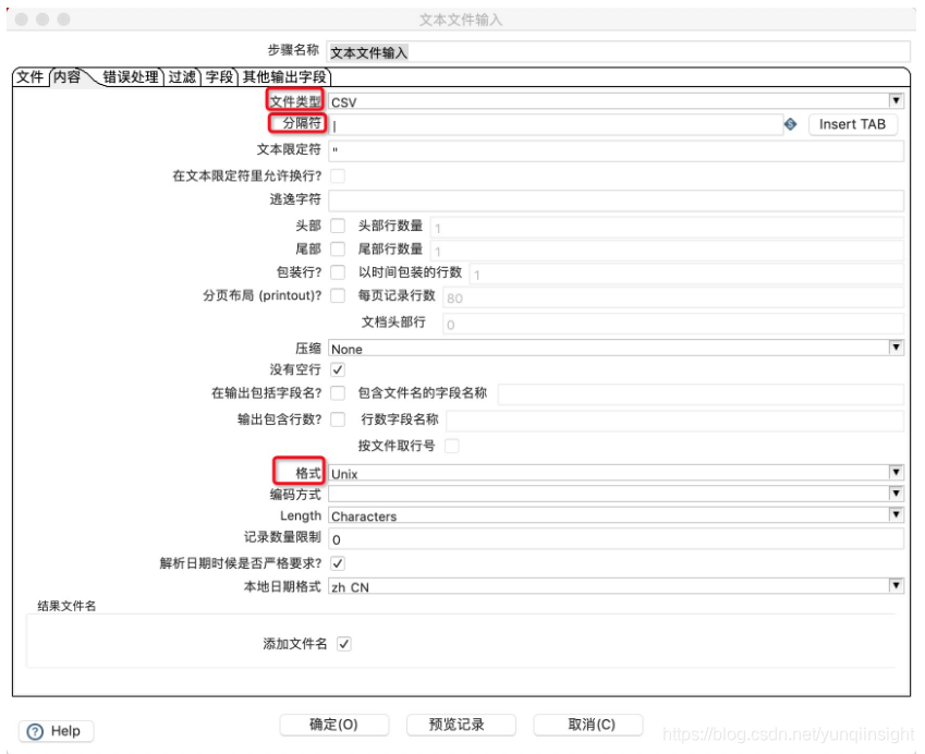 - 在“内容”选项卡中配置输入文件的分隔符。