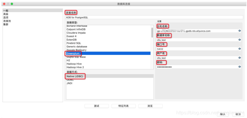 4.在转换中新建一个Greenplum数据库连接作为输入源,详细的参数配置如下表所示。