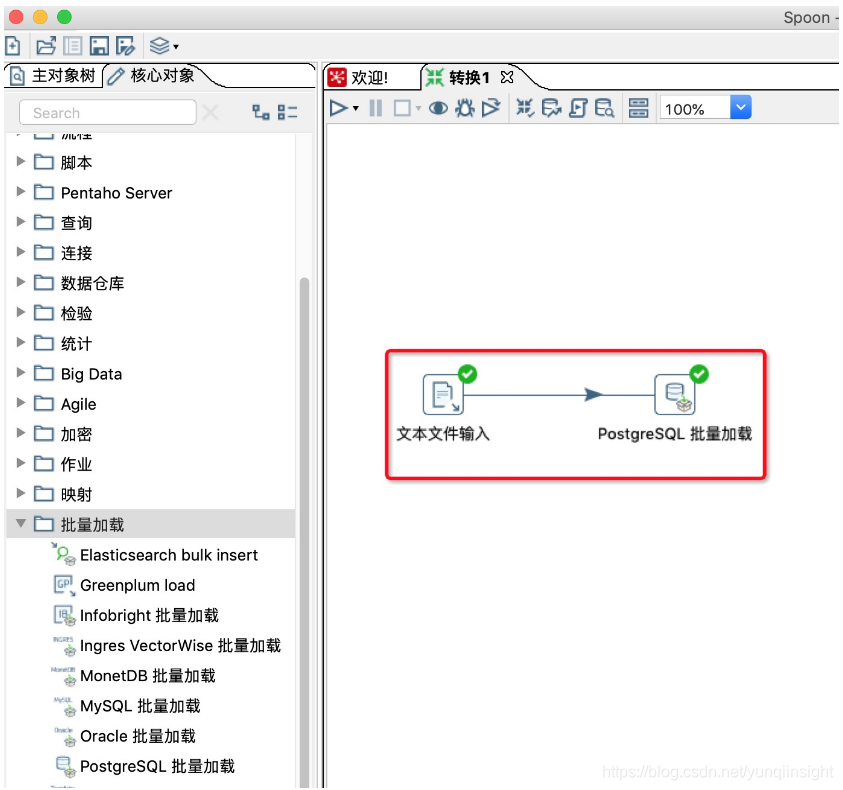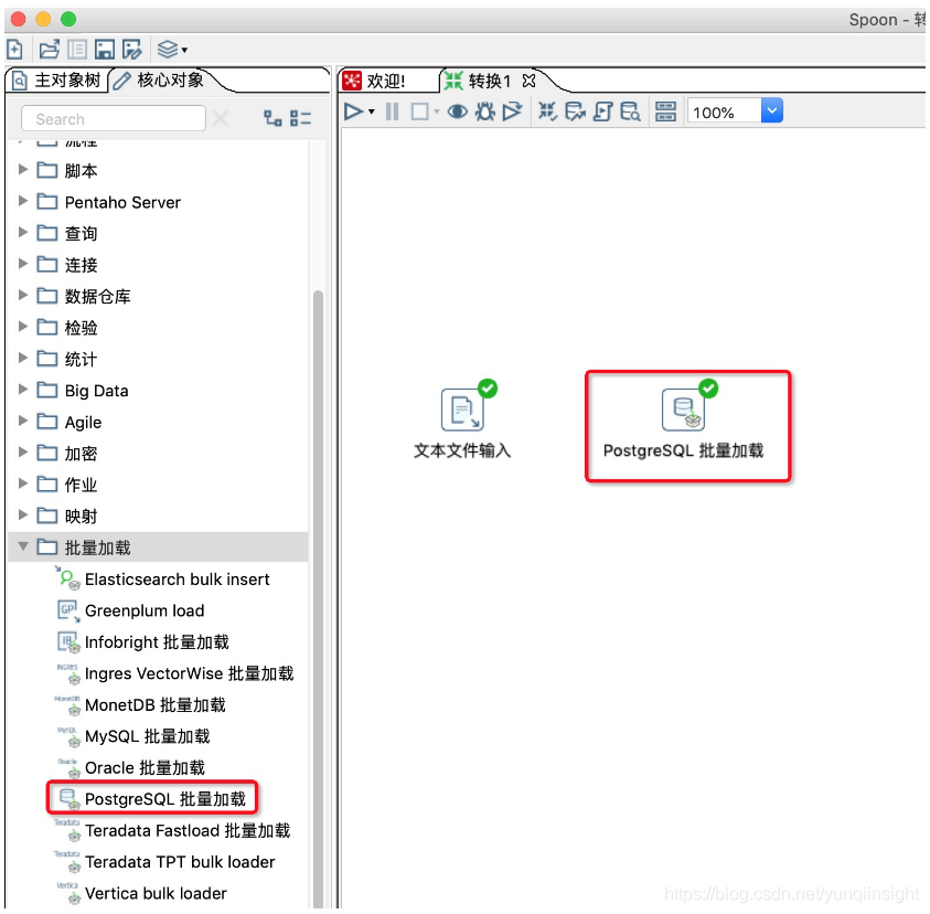 - 在Kettle左侧核心对象的批量加载中,找到PostgreSQL批量加载,并将其拖动入到工作区。