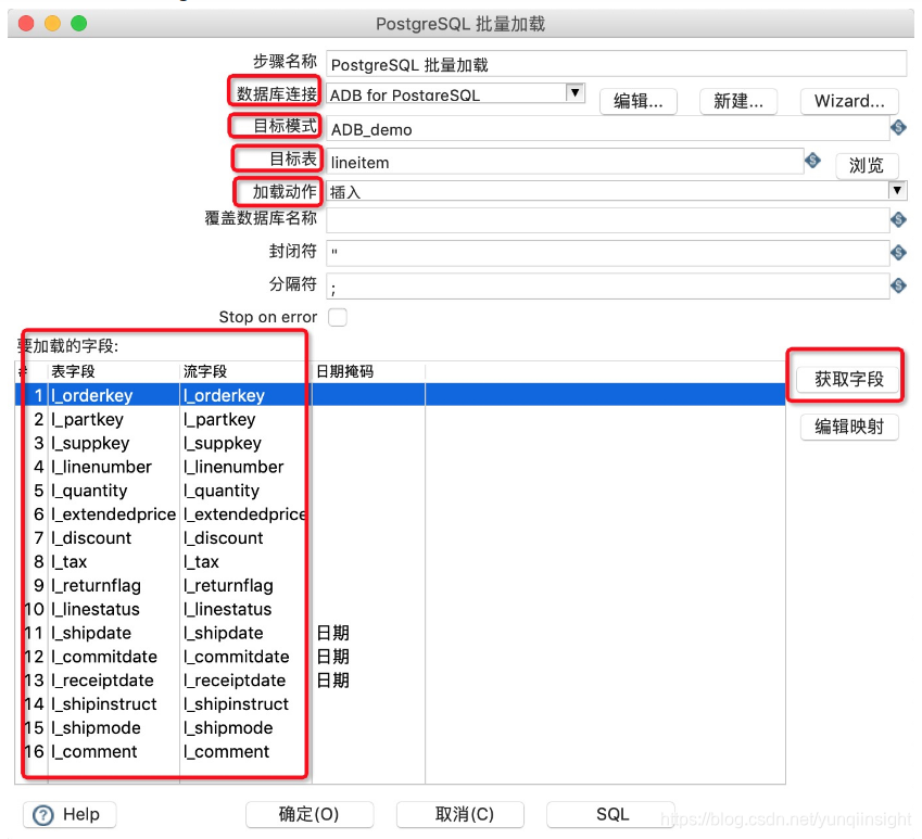 - 双击工作区的PostgreSQL批量加载图表,在批量加载对话框中进行参数配置: