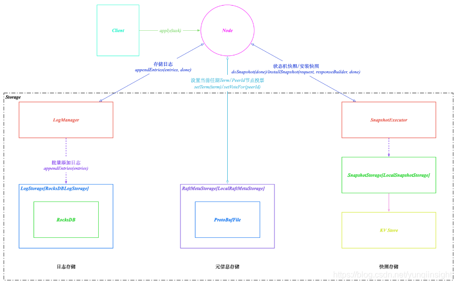 本文从 Log 日志存储 LogStorage、Meta 元信息存储 RaftMetaStorage 以及 Snapshot 快照存储 SnapshotStorage 三个方面详述 SOFAJRaft 存储模块实现细节,直观刻画 SOFAJRaft Server 节点 Node 之间存储日志、Raft 配置和镜像流程。