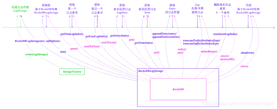 LogStorage 默认实现 RocksDBLogStorage 是基于 RocksDB 存储日志,初始化日志存储 StorageFactory 根据 Raft节点日志存储路径和 Raft 内部实现是否调用 fsync 配置默认创建 RocksDBLogStorage 日志存储。基于 RocksDB 存储实现 RocksDBLogStorage 核心操作包括: