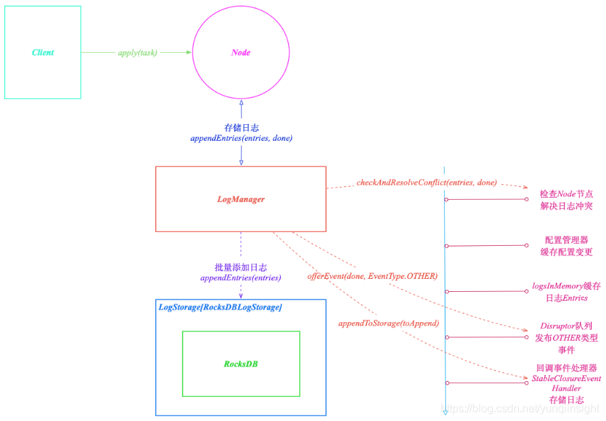 - appendEntry(entry):检查日志 LogEntry 类型是否为配置变更,配置变更类型调用 RocksDB#write() 方法执行批量写入,用户提交任务的日志基于处理器 defaultHandle 和 LogEntry 对象调用 RocksDB#put() 方法存储。