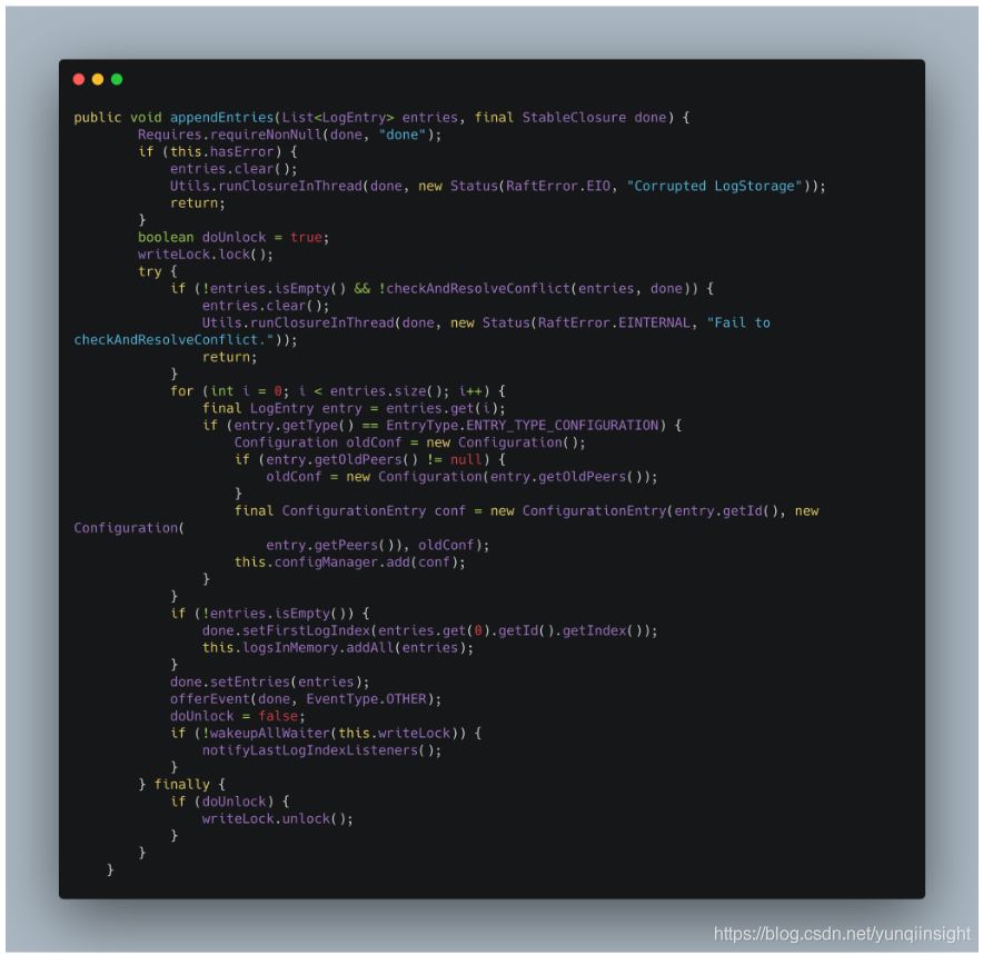 LogManager 调用日志存储 LogStorage 实现逻辑: