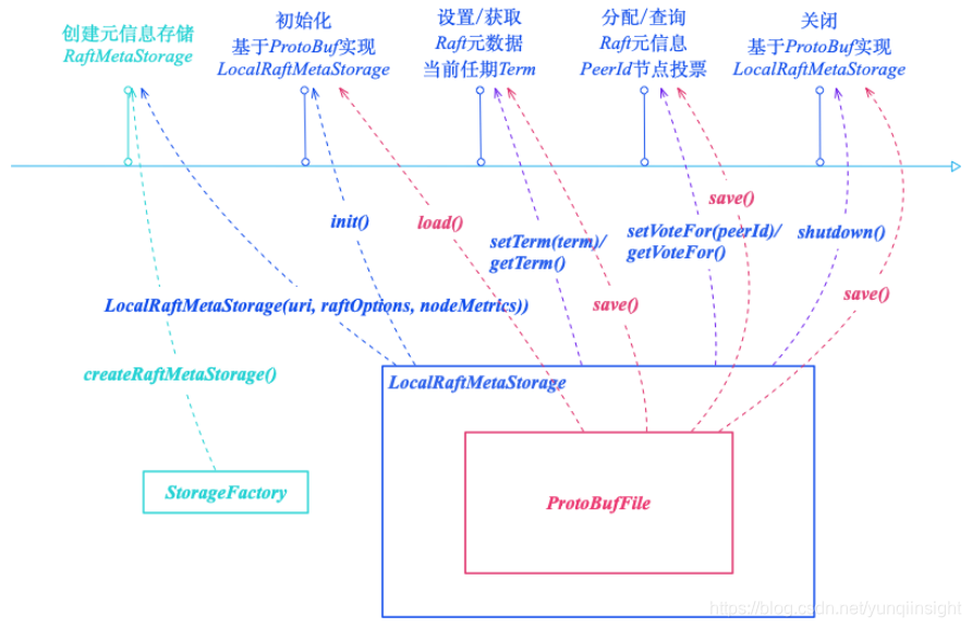 - init():获取 Raft 元信息存储配置 RaftMetaStorageOptions 节点 Node,读取命名为 raft_meta 的 ProtoBufFile 文件加载 StablePBMeta 消息,根据 StablePBMeta ProtoBuf 元数据缓存 Raft 当前任期 Term 和 PeerId 节点投票信息。