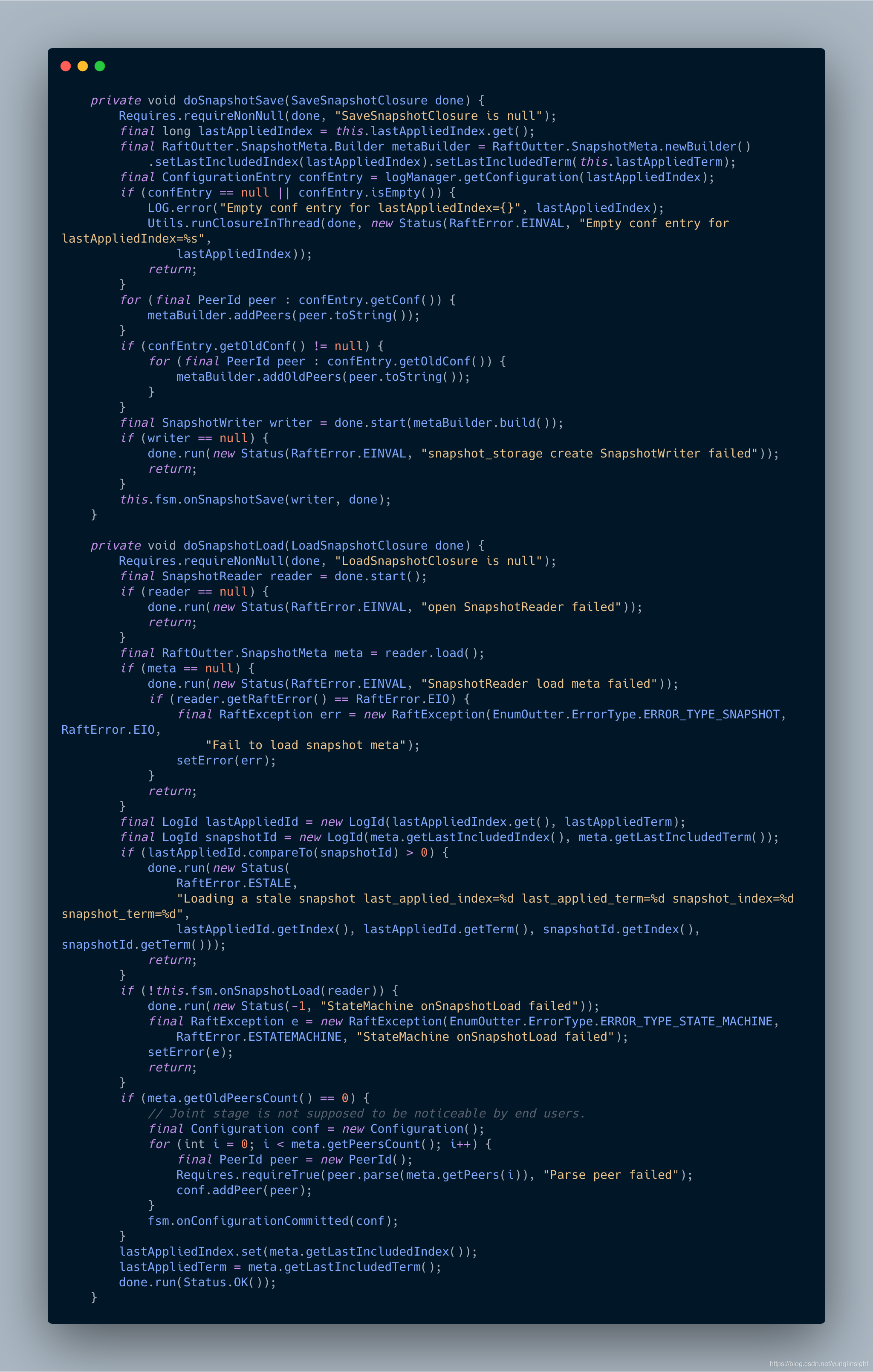 - init():删除文件命名为 temp 的临时镜像 Snapshot,销毁文件前缀为 snapshot_ 的旧快照 Snapshot,获取快照最后一个索引 lastSnapshotIndex。