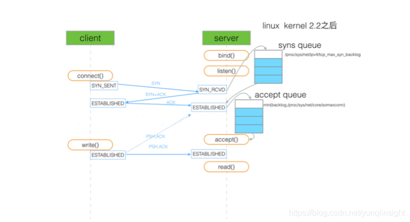 下图所示为Client端与Server端的协作示意图。Client端首先向Server端发起带有SYN标识的握手请求,Server端接受到请求后,返回给Client端带有SYN与ACK标识的请求并将Client端中的RCVD文件加载至队列中,在三次握手完成之后,该文件描述符将被添加至accept队列中等待下一步逻辑处理。