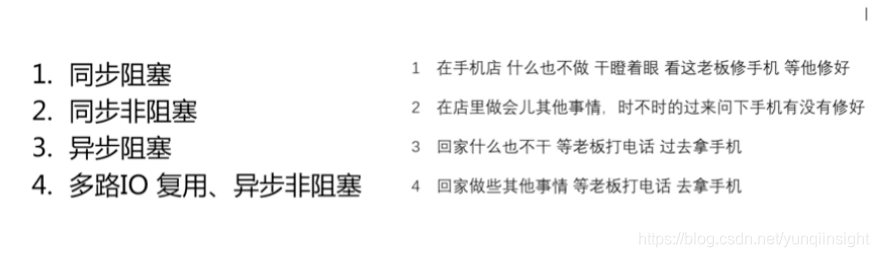 下图举了生活中与网络阻塞类似的生活事例来展示该过程。在用户到手机店修手机的过程中,用户在手机店不做任何事,等待老板将手机修好类似于网络同步阻塞过程;用户在店中做些其他工作,不时询问老板手机是否修好类似于同步非阻塞过程;用户回到家中,等待手机店老板修好后的电话类似于异步阻塞过程;用户回到家中做其他事情,等待老板修好后的电话类似于多路IO 复用、异步非阻塞过程。