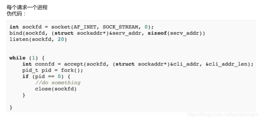 在一款应用开发初期,应用的用户不多,服务器相对的要求同样不高,此时开发者可以使用多进程策略进行应用的开发,以此加快开发效率。下图所示为多进程同步阻塞开发的伪代码。