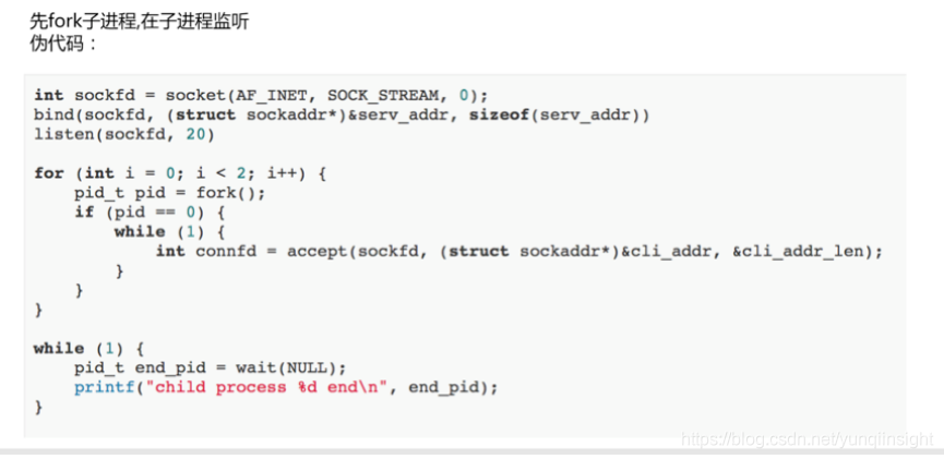 当业务量扩大,系统需要进行优化时,开发者可以对每个子进程中的套接字进行监听,其伪代码如下图所示。