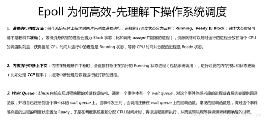 操作系统进程调用时分为正在运行,阻塞运行及等待运行三个状态。在处理进程的过程中,内核会不断发生中断,比如三次握手过程中,当ACK发送时,内核会触发中断,系统此时需要放下正在执行的任务,去处理TCP的任务。处理完成后,系统结束中断处理并恢复运行被打断的进程。下图所示为操作系统进程调度的一些方法。