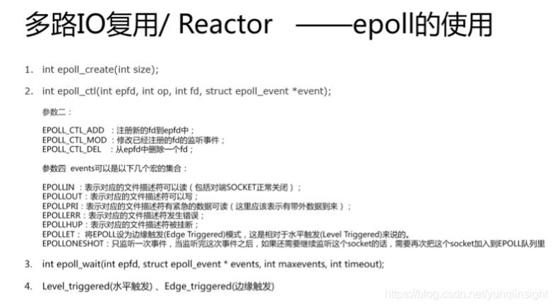 Epoll主要用来监听Socket的可读可写过程,在Epoll创建时,开发者需要传对应文件描述符EPOLLIN与EPOLLOUT作为可读与可写的参数标志,epoll_wait函数拥有accept的功能,会在事件发送后提醒开发者。下图罗列了Epoll中的参数与主要方法。