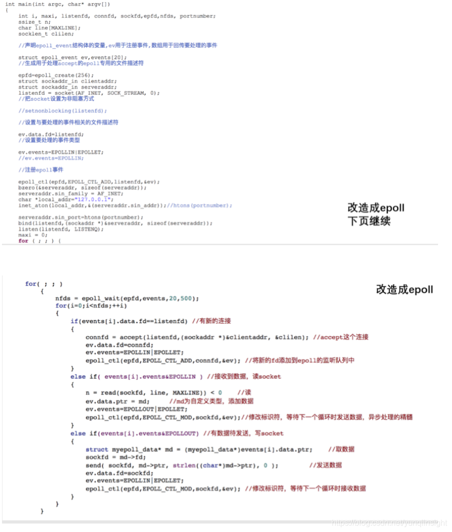将Socket创建与accept过程转化为Epoll的代码示意图如下所示。首先将fd作为描述符加入创建好的Epoll中,同时把开发者想要监听的可读可写事件也注册入Epoll之中。当listen fd监听到事件时,使用accept方法将该fd描述符设为可读事件,并再次将其加入到Epoll的监听数组中,此时代表真正的客户端连接已接入。