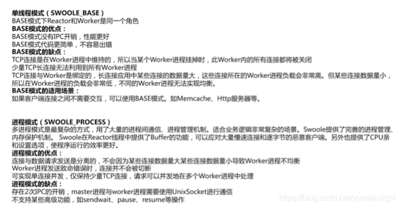 Swoole目前使用较多的模式为单线程模式与进程模式。在单线程模式中,系统使用Worker监听accept与链接,当Worker挂掉后会对系统产生一些影响。进程模式的Swoole解决了这些问题。下图为两种模式的详细对比。