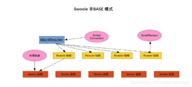 在进程模式中,系统采用MainReactor线程监听accept,线程将出现的问题抛给Worker进程进行处理,这样即使单个Worker进程挂掉也不会对系统产生任何的影响。下图所示为进程模式的系统结构示意图。
