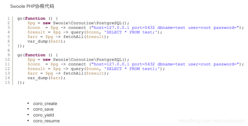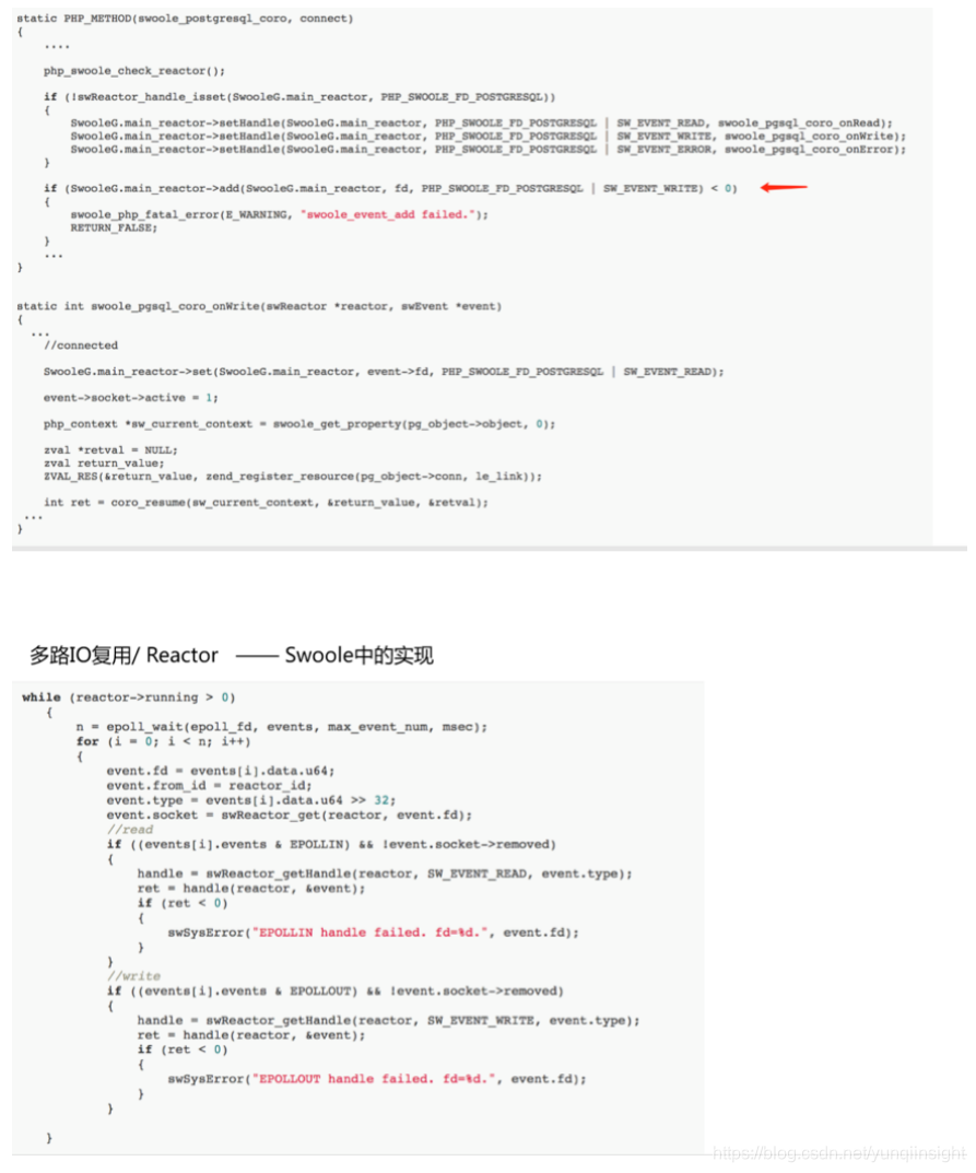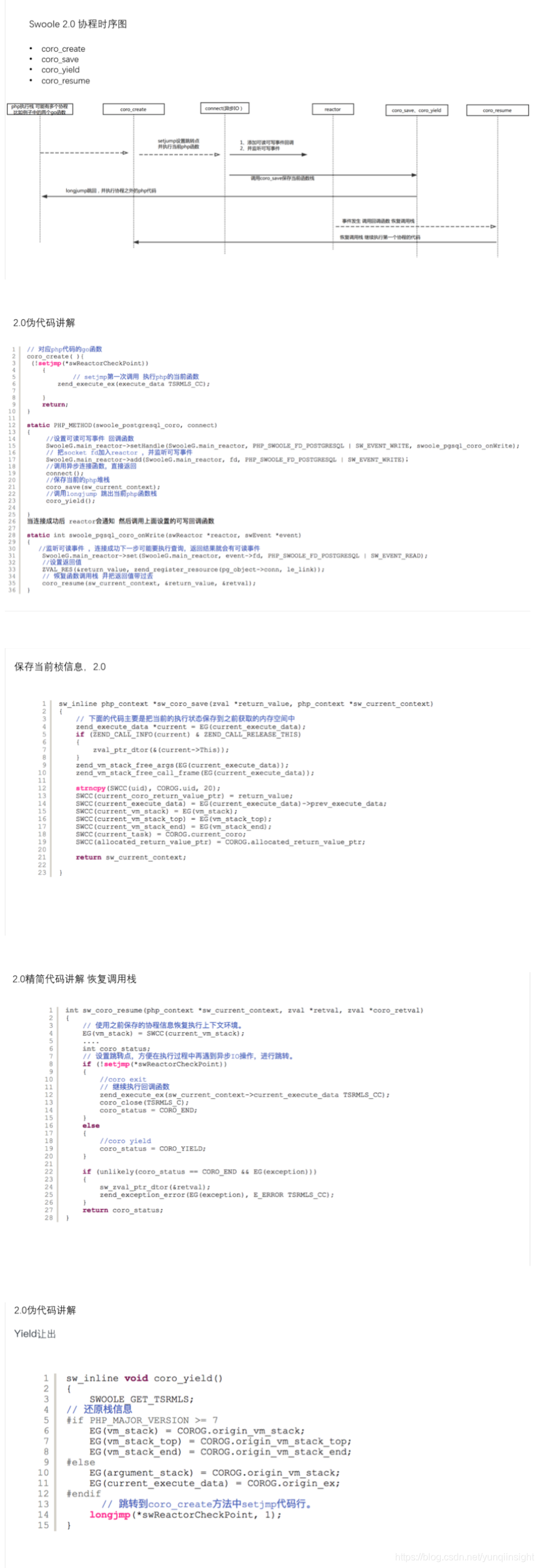 Swoole2.0协程时序图与代码展示如下图所示。setjump方法设置当前函数堆栈,当有网络事件产生时,系统将首先对产生的事件进行注册,并在有事件通知时跳回执行中的代码,以此完成代码协程过程。