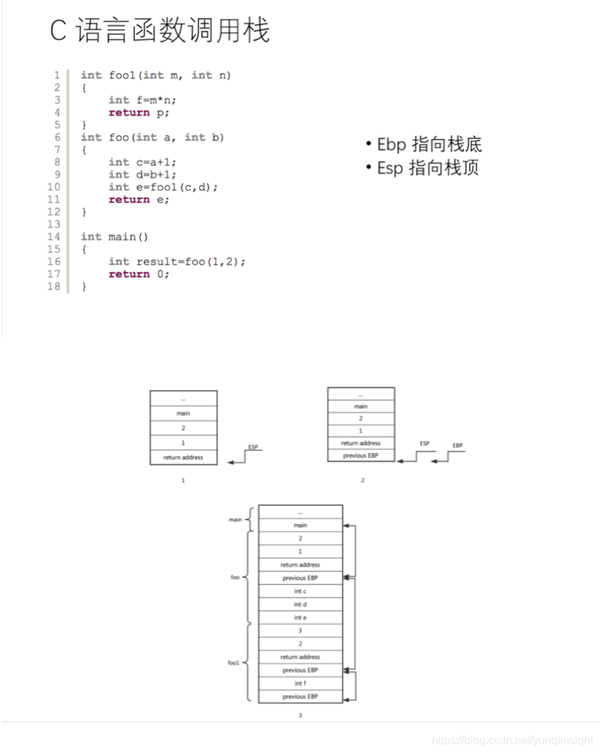在C语言环境中,事件的调用往往使用堆栈进行处理。在堆栈中,指针EBP指向堆栈栈底,指针ESP指向堆栈栈顶,在函数调用之后,每个EBP的返回值会返回上一个EBP的地址。以此来进行事件调用的检索。下图所示为C语言中的事件调用示意图。