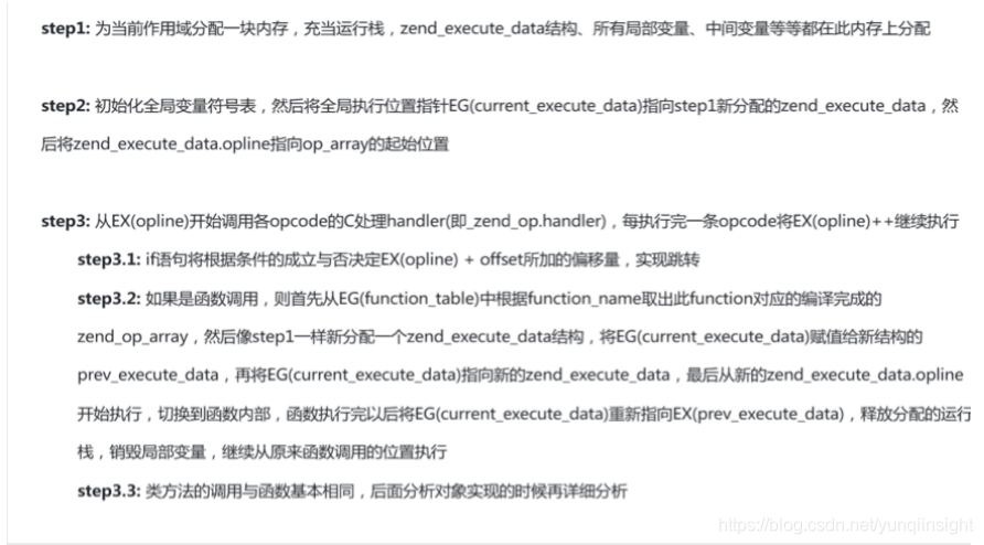 在PHP中的函数调用步骤如下图所示。PHP首先通过词法分析与语法分析将代码编译成语法树,语法树中的每一个语法会被编译入opcode,语法中的每一个函数会以oparray的形式存入结构体EG中,EG结构体使用函数表对这些函数进行存储。