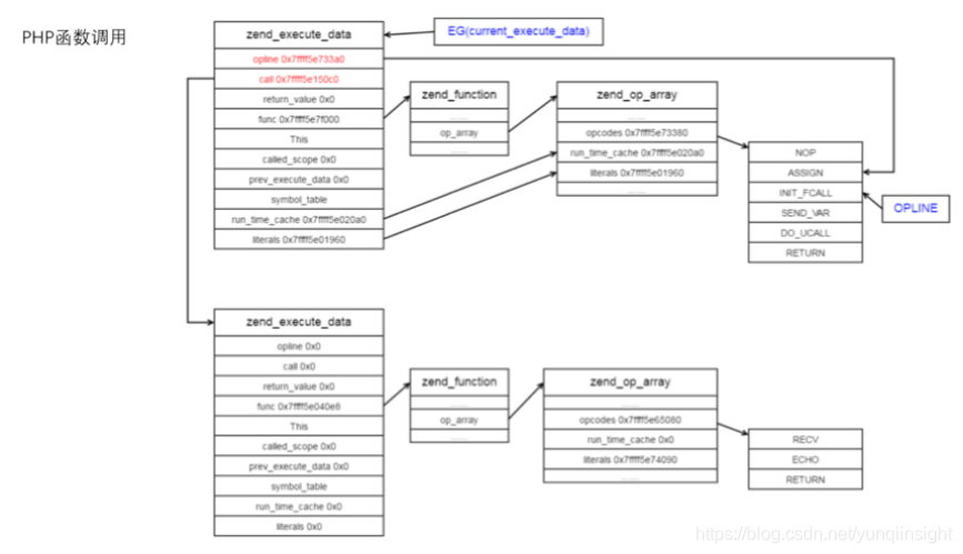 当函数调用时,结构体中的call对应指针ESP,prev对应于指针EBP。当用户调取函数时,系统会向zend VM中为每一个方法申请一个堆栈的内存。当系统中一个函数调用其他函数时,会调用code下方储存的地址,调用方法的opcode从function存储的成员中找到并进行编译与执行。当触发了opcode后,系统会申请一个新的内存来进行新的内存分配。下图为PHP调用示意图。
