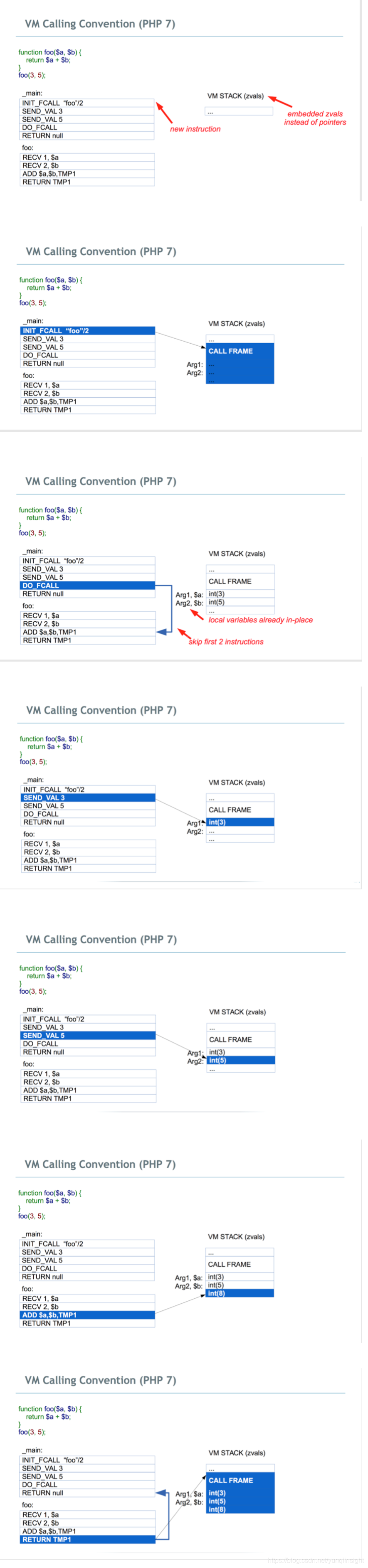 下图所示为在PHP函数调用中压栈的过程及函数中存在的opcode。FCALL与DO_FCALL负责函数的调用,当堆栈中第一个opcode执行时,将进行参数压栈的操作。触发函数调用时,将执行DO_FCALL操作,系统将会把下一个函数的调用地址压入堆栈。当调用有结果后系统会将返回值返回入CALL FRAME中。