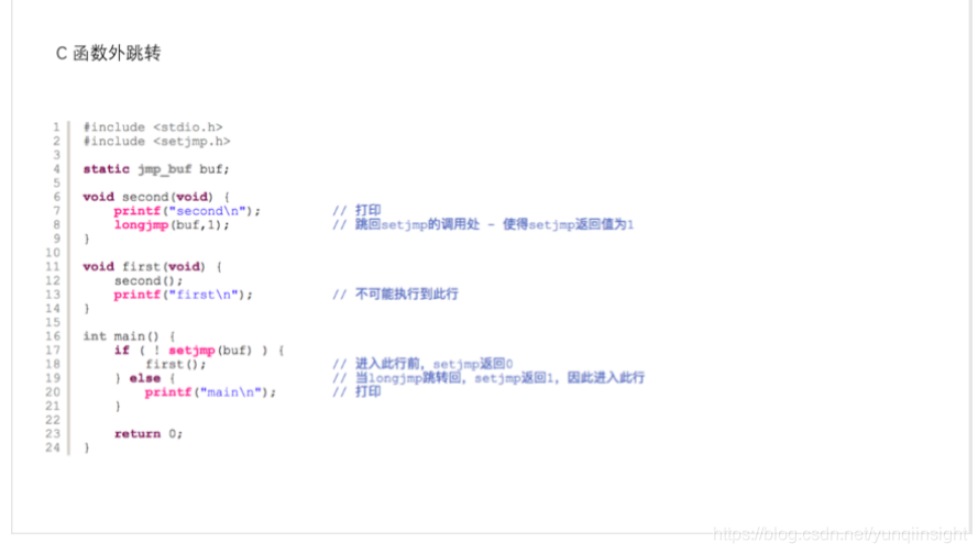 在Swoole2.0中使用C函数进行线程任务的协程。当开发者调用setjmp时,函数的返回值为0并调起first函数。当调用longjmp时,setjmp也同样被调起,此时返回值为1。Swoole2.0利用该代码实现了PHP执行的跳转,代码示意图如下。