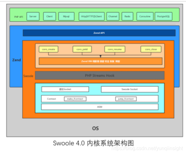 Swoole4.0通过实现C堆栈对Swoole2.0中的问题进行了改进。在Swoole4.0中用户直接调用MySQL中的链接直接就可以形成网络协程。下图所示为Swoole4.0内核系统架构示意图。
