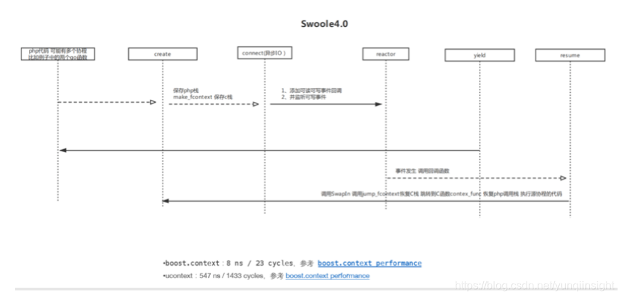 Swoole4.0的时序调度与Swoole2.0差别不大,不同的是Swoole4.0使用汇编指令对C栈与堆栈进行了存储。在协程创建时,系统会产生C栈与PHP栈,两个堆栈间会进行通信,通过这种方法解决了C栈销毁后的一些问题。下图展现了Swoole4.0的时序图。