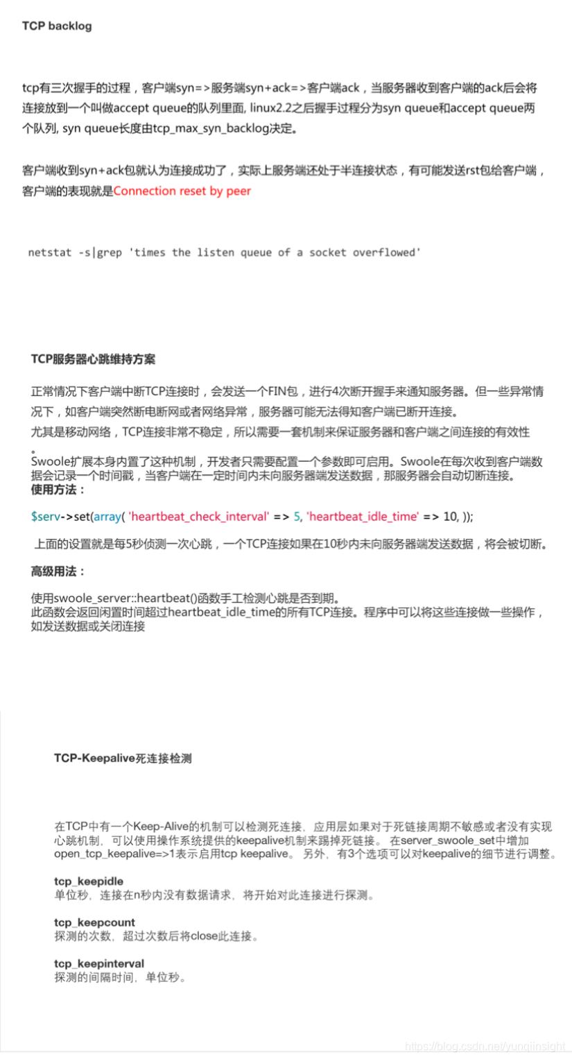当系统链接数量增多后会出现一些问题,开发者通过设置心跳参数与心跳收回可以保证系统服务器的资源不会被浪费。下图列举了Swoole网络编程对系统进行优化的方式。