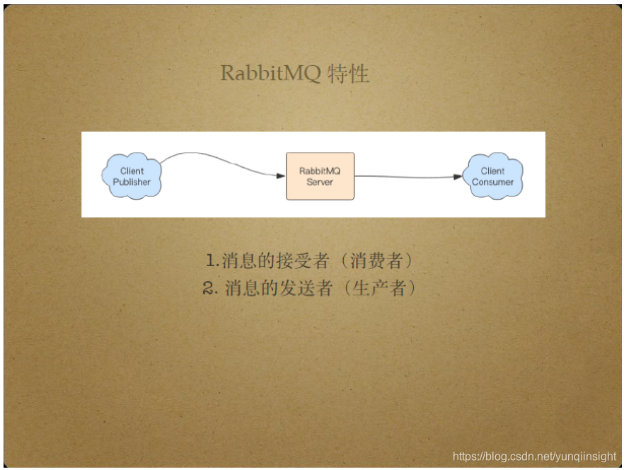 对于左边的Client Publisher而言,RabbitMQ Server是消息的接收者,也就是消费者;对于右边的Client Consumer而言,RabbitMQ Server是消息的发送者,也就是生产者。RabbitMQ Server将消息从Client Publisher传送给Client Consumer,扮演着消息中间商的角色。