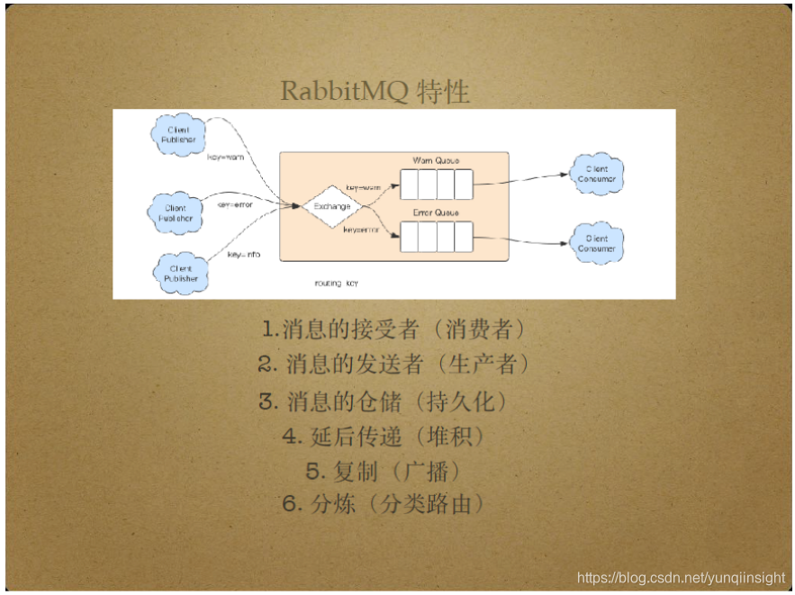 另外,RabbitMQ Server还具有复制和广播消息的能力。具体来说,RabbitMQ Server可以将Client Publisher发布的消息分发给多个消费者,比如它能够将特定的消息按照特定的队列分发给特定的消费者。“特定”指不同消息具有不同的routing key属性,由上图实例,不同的消息生产者生产了具有不同routing key的消息,通过exchange路由器将不同的routing key消息投递到不同队列,从而分发给不同消费者。