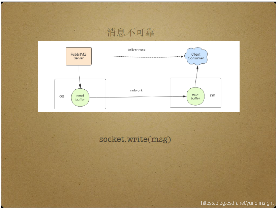 实际上,RabbitMQ Server将消息投递给消费者,具有消息不可靠的特点。具体来说,RabbitMQ Server将消息投递给消费者时会调用套接字的write操作,而write操作的过程是不可靠性的。在write操作的过程中,Server需要将消息发送到套接字的缓存中,通过网卡转发到链路上,最终到达消费者所在的机器内核的套接字缓存中,由消费者使用套接字的read操作将消息读出来。