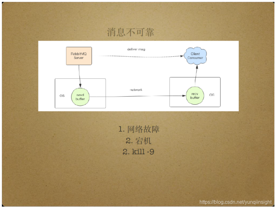 即使套接字的write操作成功也无法保证消息可靠,潜在的网络故障可能使消费者接收不到消息。机器宕机也可能使消息不可靠,即使消息字节流已经到达消费者所在机器,消费者所在机器的宕机也可能使消息无法被即时读取并处理。另外,即使消费者即时读取消息,内存消息队列中的所有消息也可能因为kill-9操作发生丢失。这些可能性都直接导致了消息不可靠。