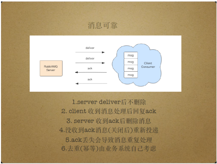 因此,需要额外的措施为消息提供可靠保障。一种消息可靠性保障方式是,Server投递消息后并不立即将消息从Server删除,而是等到消费者接收、处理消息并返回Ack包给Server后,Server才删除该消息。如果消费者没有发送Ack包,那么Server将重新投递该消息。这个过程确保消息被消费者处理,保证了消息可靠。另外,假如消费者已处理消息并发送Ack包给Server,但由于网络故障等问题导致Ack包丢失时,那么Server同样会重新投递该消息,导致消息被重复处理。消息的重复处理通常由业务层面的技术手段来避免,比如在数据库层面添加主键约束等。另一种重复消息处理的避免方式是客户端对每条消息维护ID, 将被处理消息的ID记录在列表中,同时检查新到消息是否在该列表中。