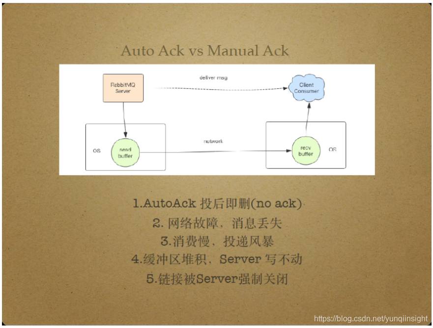 RabbitMQ中的Auto Ack和Manual Ack对应着消息不可靠模式和消息可靠模式. Auto Ack即no ack,指消息投后即删除,对应消息不可靠传输。Manual Ack即手动Ack,消费者处理完消息后使用Ack包通知Server删除消息,对应消息可靠传输。