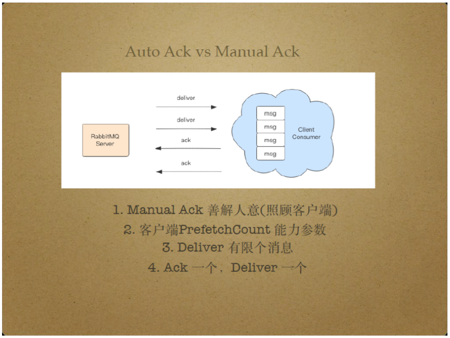 Manual Ack是RabbitMQ 中更加智能的一种模式。Manual Ack在工作时会考虑消息消费者的消息接收能力,根据消费者的消息接受能力和当前接收到的Ack包自动调节分发消息的速率,保证消息分发可靠、不阻塞。具体来说,客户端通过PrefetchCount告知Server自身堆积消息的能力。