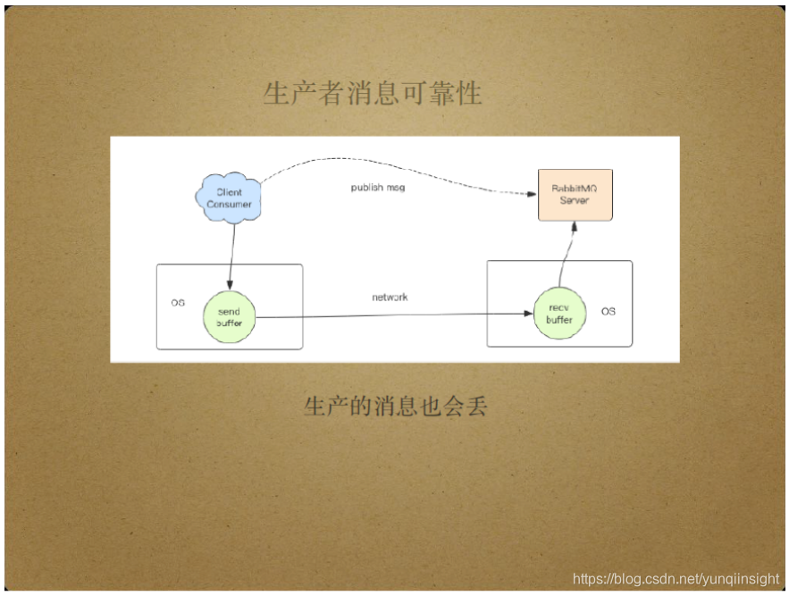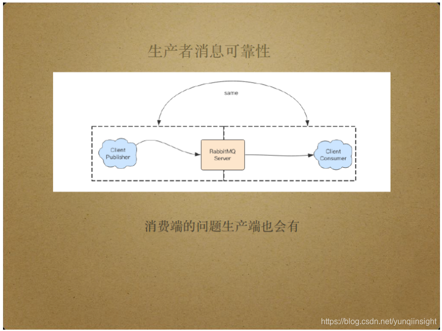 消息生产端同样存在消息的可靠性问题。从Client Publisher将消息传递给Server和从Server将消息传递给Client Consumer的过程是完全对等的,Server和Client Consumer间传递消息的可靠性问题在Client Publisher和Server间同样存在。