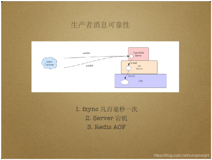 另外,Server端本身也可能导致消息不可靠。Server端需要持久化消息,但出于性能开销的考虑,Server端并不在每次持久化消息时都刷盘。具体来说,Server端会对文件执行write操作,将脏数据写入操作系统的缓存中,而不是立即将数据写入磁盘。一般情况下,Server可能每几百毫秒执行一次fsync操作,通过fsync操作将文件的脏数据写入磁盘。由于Server具有宕机风险,那么每次Server宕机时,还未被fsync操作处理的数据就可能丢失,此过程类似于Redis AOF。